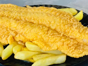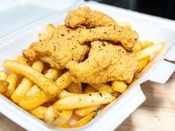 Mouth watering fried Catfish cut into nuggets and served with French fries.