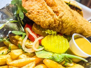 This baby is huge! 5-7oz fried Catfish filet, served on a toasted bun, lettuce, tomato, pickles and onions with French fries.
