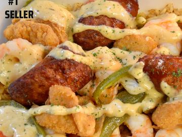 Our #1 seller!!!!! This is a seafood delight. Our special seafood rice loaded with garlic shrimp, catfish nuggets, smoked sausage, onions, sweet peppers and topped with our signature sauce.