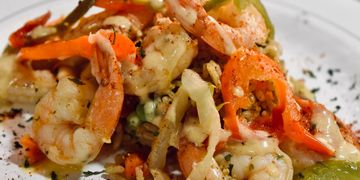 10 large shrimp garlic shrimp served over seafood rice, onions & peppers, topped with our signature creamy sauce.