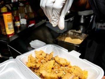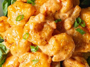 10 breaded shrimp dipped in our delicious Bang Bang sauce and served over your choice of fries or seafood rice.