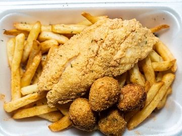 6-8 oz fried Grouper, Fries, Hush Puppies
