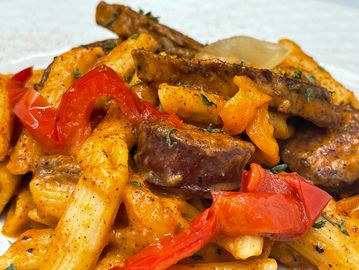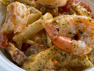 A combination of garlic shrimp, smoked sausage, onions, peppers with our signature creamy white sauce served over Penne noodles.