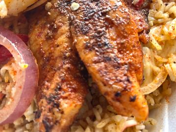 6-8oz grilled Grouper served over seafood rice with onions peppers and our signature sauce.