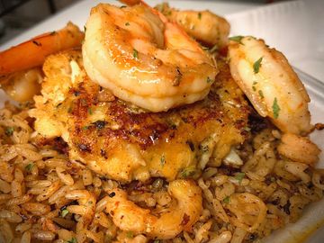 3 to 4oz Broiled Crab Cake served over Seafood Rice, 4 large garlic shrimp. (100% Jumbo lump blue crab meat)