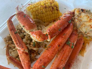 1 cluster of Alaskan snow crabs, corn and seafood rice.