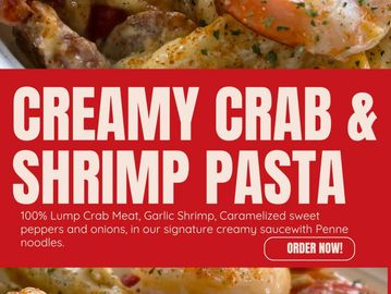 100% Lump Crab Meat, Garlic Shrimp, caramelized Sweet Peppers & Onions, Penne noodles in our signature Creamy sauce.