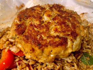 3 to 4oz Broiled Crab Cake served over Seafood rice. (100% Jumbo lump blue crab meat).